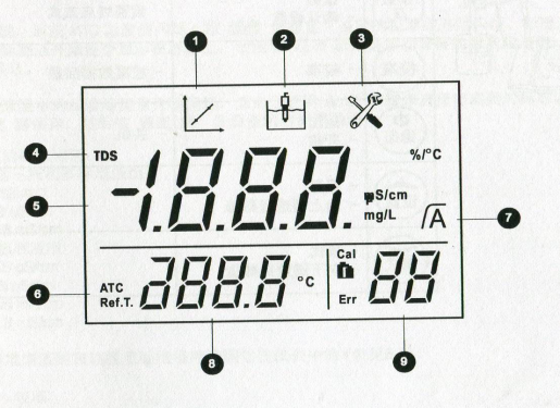 ④TDS因子設置或參數(shù)設置 ⑤電導率/TDS讀數(shù)或電極常數(shù) ⑥自動溫度補償